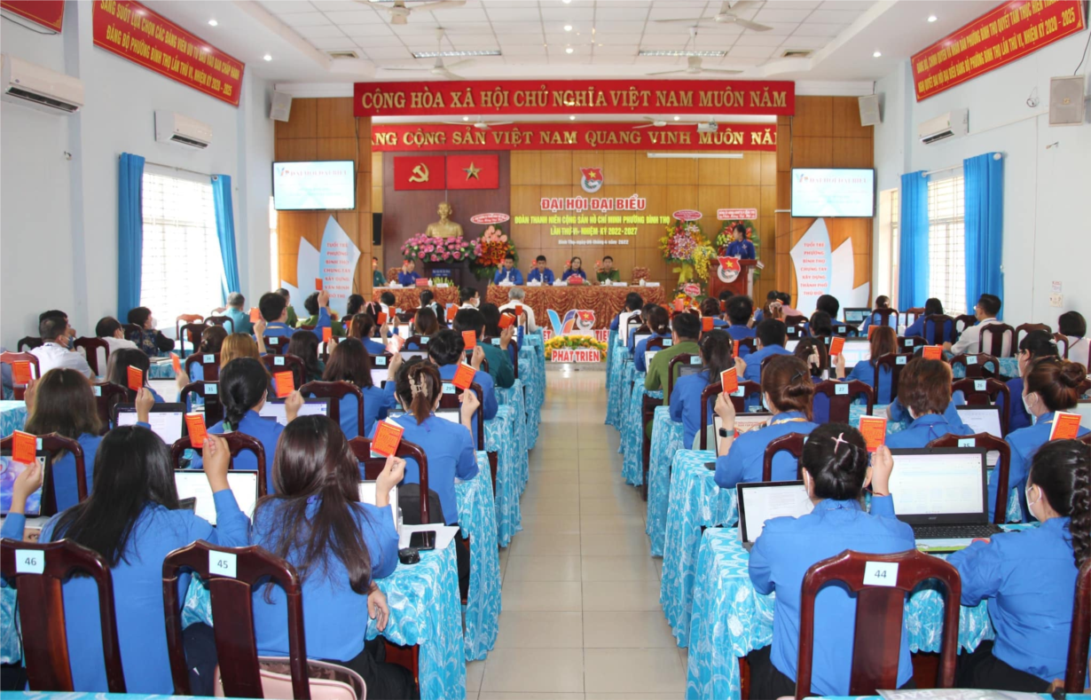 Với khẩu hiệu “TUỔI TRẺ PHƯỜNG BÌNH THỌ TIÊN PHONG – BẢN LĨNH – ĐOÀN KẾT – SÁNG TẠO – PHÁT TRIỂN” đại hội đã bầu Ban Chấp hành lần VI, nhiệm kỳ 2022 – 2027 gồm 09 đồng chí có đủ tiêu chuẩn, tiêu biểu cho tuổi trẻ phường ra mắt đại hội. Tiến hành bầu Bí thư trực tiếp tại Đại hội, đồng chí Bùi Thị Oanh Tiếng đã tái đắc cử chức vụ Bí thư Đoàn TNCS Hồ Chí Minh phường Bình Thọ lần VI, nhiệm kỳ 2022 – 2027.